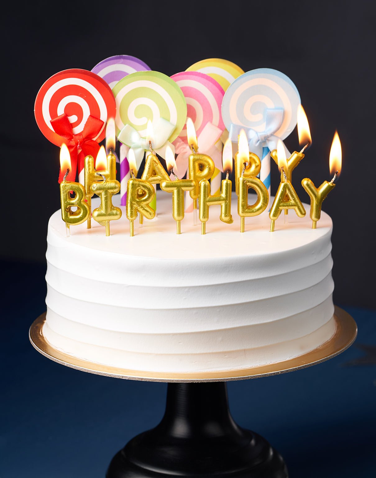 Your order also includes: A box of 5 gold candles, a cake knife and a Happy Birthday Tag.