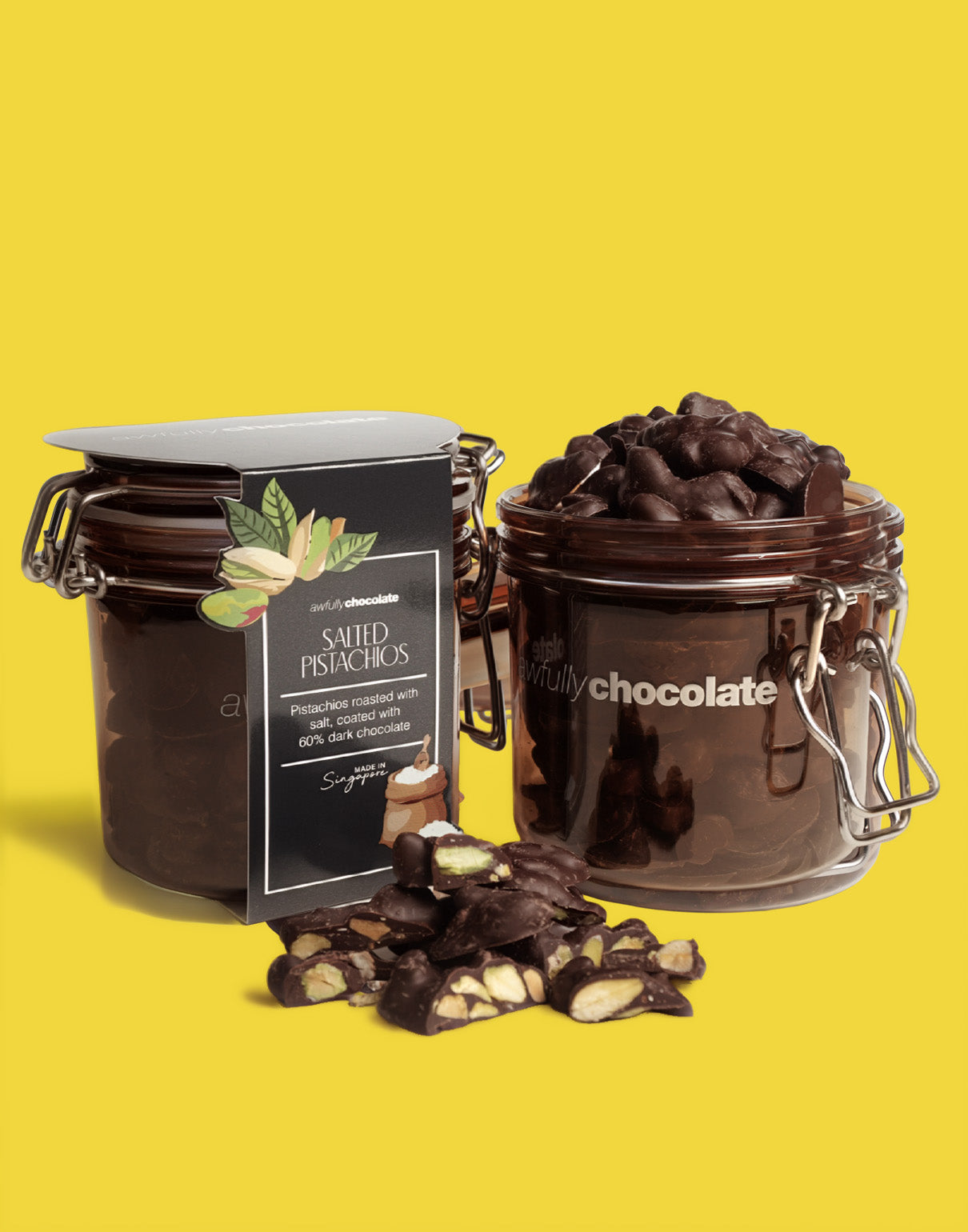 Enjoy Salt-Roasted Pistachios enrobed in 60% Dark Chocolate.